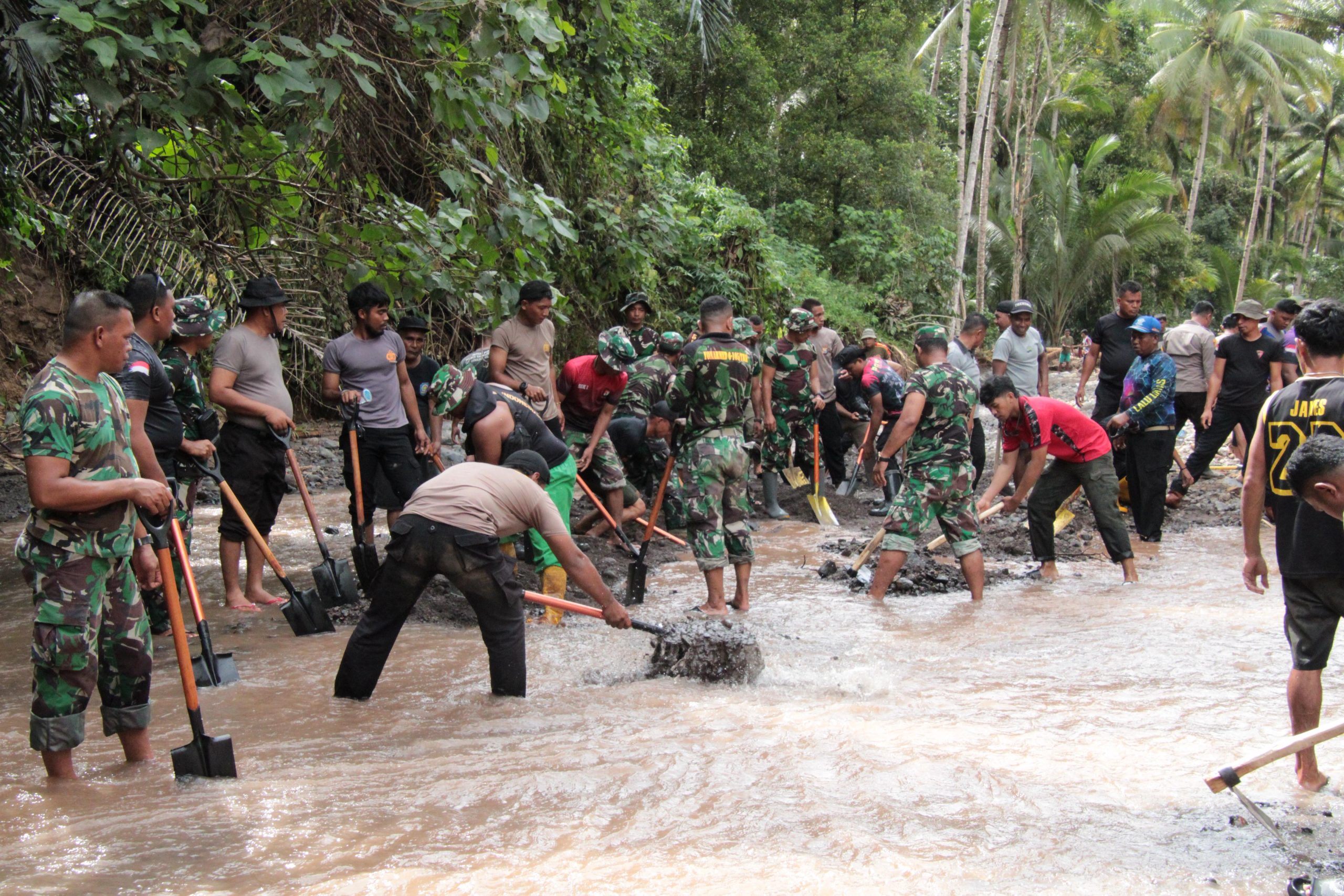 “Kompak bersama warga, petugas gabungan tersebut bahu membahu membersihkan lumpur dan sampah sisa sisa banjir kemarin.” katanya.