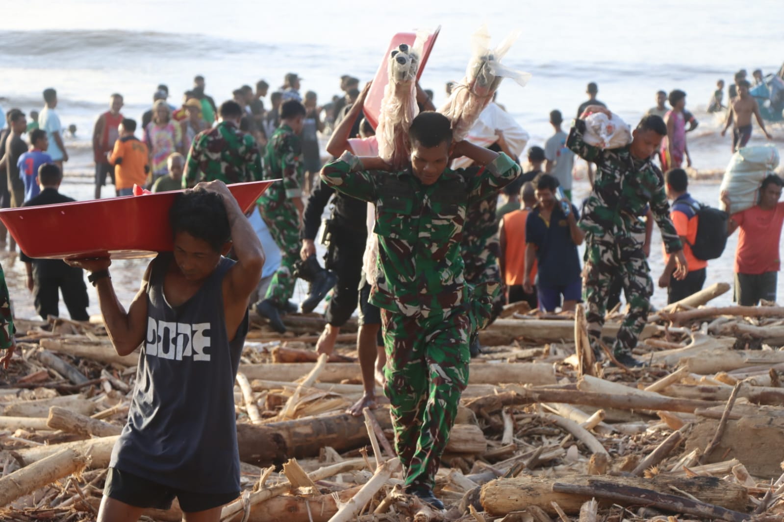 Tidak menyerah pada keadaan, prajurit bersama masyarakat setempat menempuh cara sederhana namun penuh makna. Personel dan bahan bantuan dijemput menggunakan perahu seadanya milik nelayan, kemudian dipindahkan satu per satu menuju daratan. Proses tersebut berlangsung dengan penuh kehati-hatian dan semangat kebersamaan.