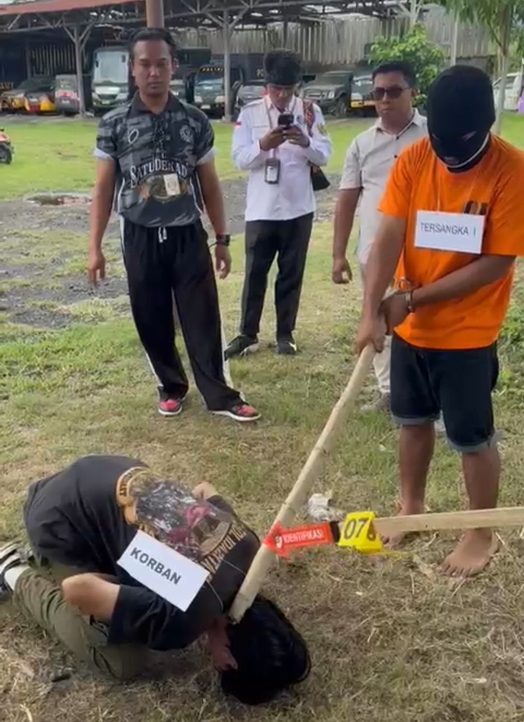 ” Di adegan ke-7, tersangka ANDRE memukul korban menggunakan kayu sehingga mengalami kejang – kejang dan meninggal, ” jelas IPDA Fajri.