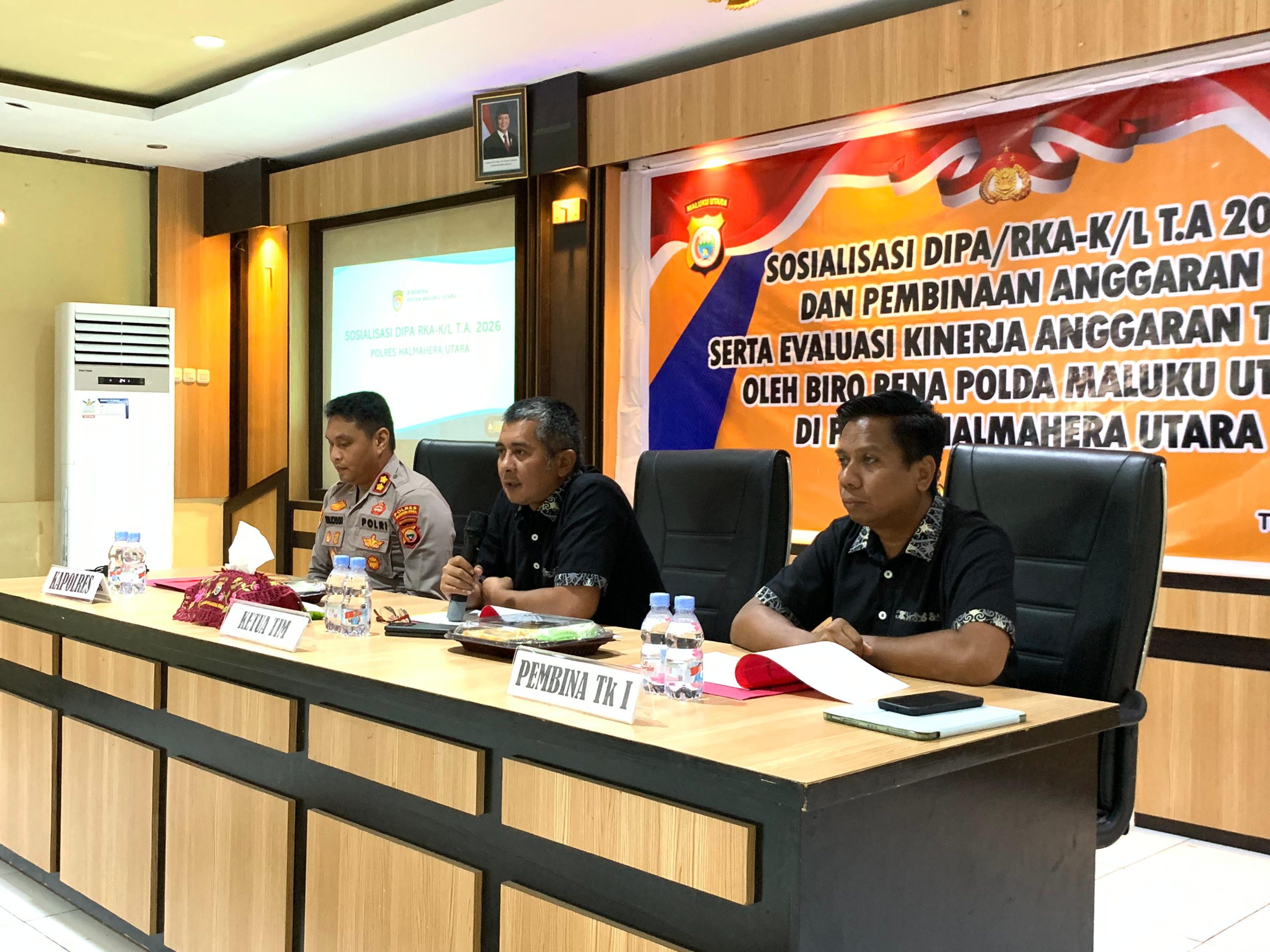 Dikesempatan yang sama, Kepala Biro Perencanaan Polda Malut Kombes Pol. Welly Abdillah, S.H., S.I.K., M.H. selaku Ketua Tim menyampaikan sosialisasi DIPA/RKA Tahun Anggaran 2026 serta evaluasi kinerja anggaran Tahun Anggaran 2025 bertujuan untuk meningkatkan kualitas perencanaan dan pelaksanaan anggaran pada satuan kerja jajaran Polda Maluku Utara, termasuk Polres Halmahera Utara.