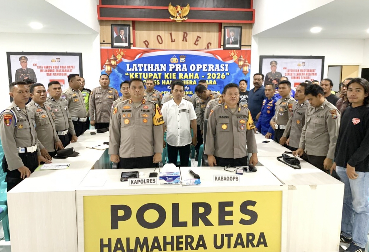 Marahaipost. com || Untuk meningkatkan kesiapsiagaan seluruh Personel Polri, khususnya jajaran Polda Maluku Utara dalam rangka pelaksanaan pengamanan Hari Raya Idul Fitri 1447 H. Polres Halmahera Utara mengikuti kegiatan latihan Pra operasi (Latpra Ops) ketupat Kie Raha 2026, yang pimpin langsung oleh Kapolda Maluku Utara, Irjen Pol. Drs. Waris Agono, M.Si, dan diikuti oleh seluruh jajaran Polres di Maluku Utara, melalui (Zoom) Meeting yang berlangsung di, Ruangan Zoom Meeting Polres Halmahera Utara, Rabu(11/03/2026)
